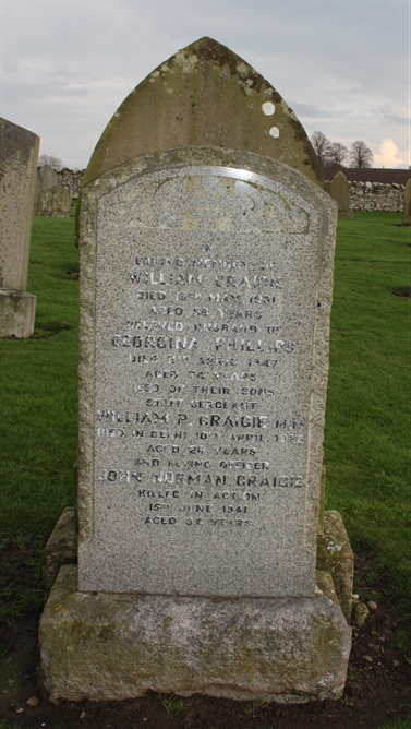 In loving memory of WILLIAM CRAIGIE died 16th May 1931 aged 56 years beloved husband of GEORGINA PHILIPS died 11th April 1947 aged 74 years. Also of their sons Staff Sergeant WILLIAM P. CRAIGIE M.M. died in Delhi 10th April 1925 aged 26 years. And Flying Officer NORMAN CRAIGIE killed in action 15th June 1941 aged 34 years.