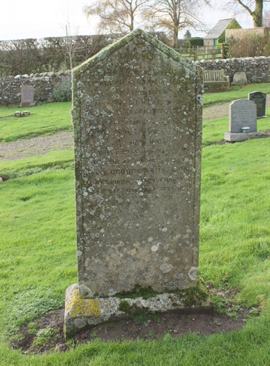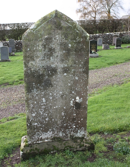 Erected by JOHN ARMSTRONG in memory of ELIZABETH JARDINE his beloved wife who died at Bartlehill 22nd February 1902 aged 67 years. Also the above JOHN ARMSTRONG who died at Bartlehill 9th February 1904 aged 78 years. Also ANN HALL who died at Wormerlaw 1st June 1927 aged 73 years. Also GEORGE ARMSTRONG who died at Dalcove Mains 24th September 1936 aged 76 years.