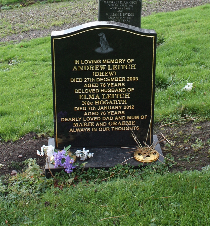 In memory of ANDREW LEITCH beloved husband of MARGARET died at Coldstream Cottage Hospital 1st June 1957 aged 54 years. And of the above MARGARET LEITCH died 3rd June 1965 aged 69 years. Also NOELEEN MARGARET MEIKLE HARGREAVES elder daughter of the above died 3rd March 1966 aged 37 years. Cremated in Edinburgh