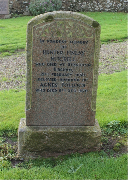 In fondest memory of HUNTER FINLAY MITCHELL who died at Strathlyn Birgham 15th February 1959 beloved husband of AGNES POLLOCK who died 9th December 1979.