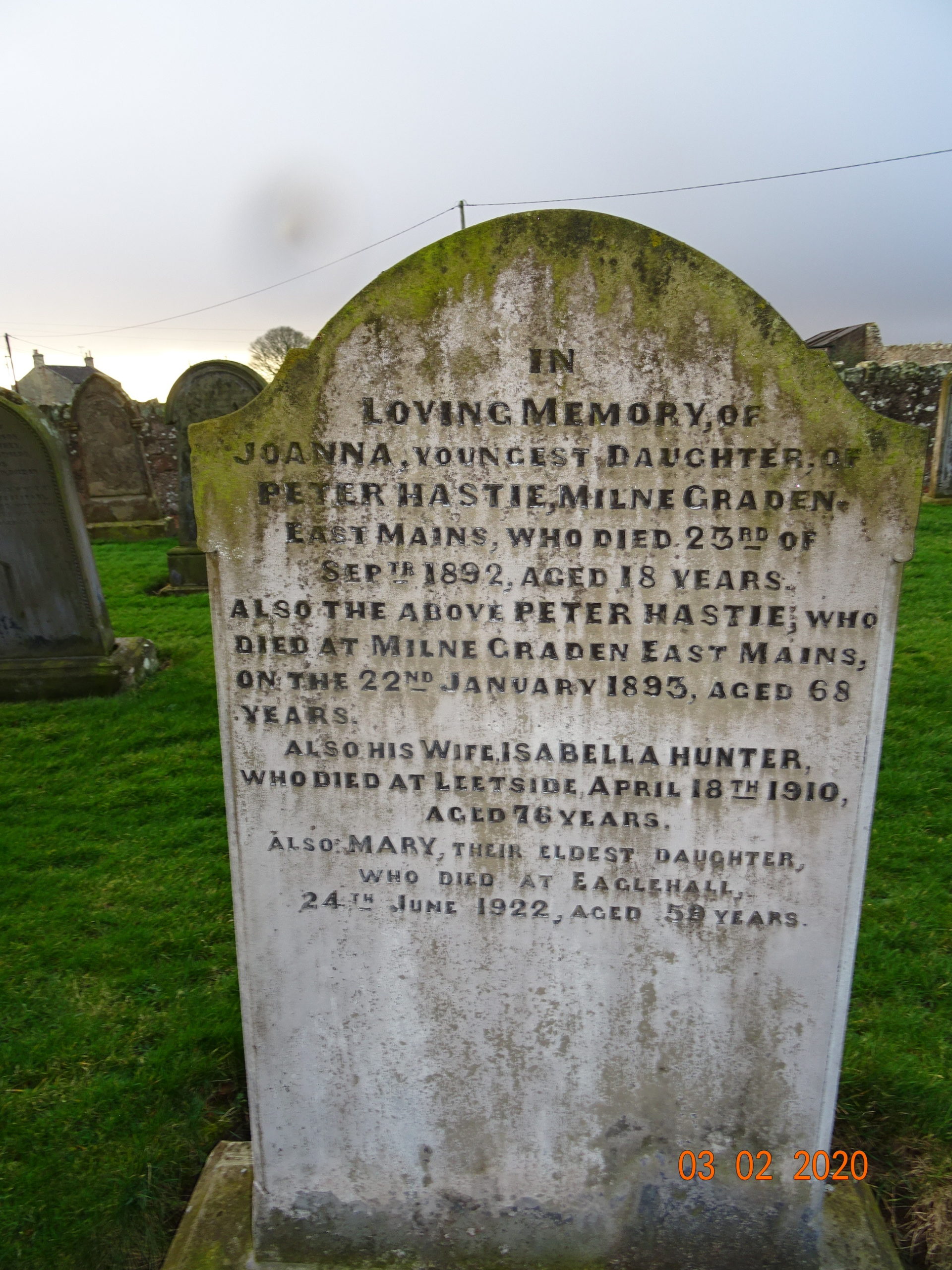 In loving memory of JOANNA youngest daughter of PETER HASTIE Milne Graden East Mains who died at Milne Graden 23rd of Sept 1892 aged 18 years.