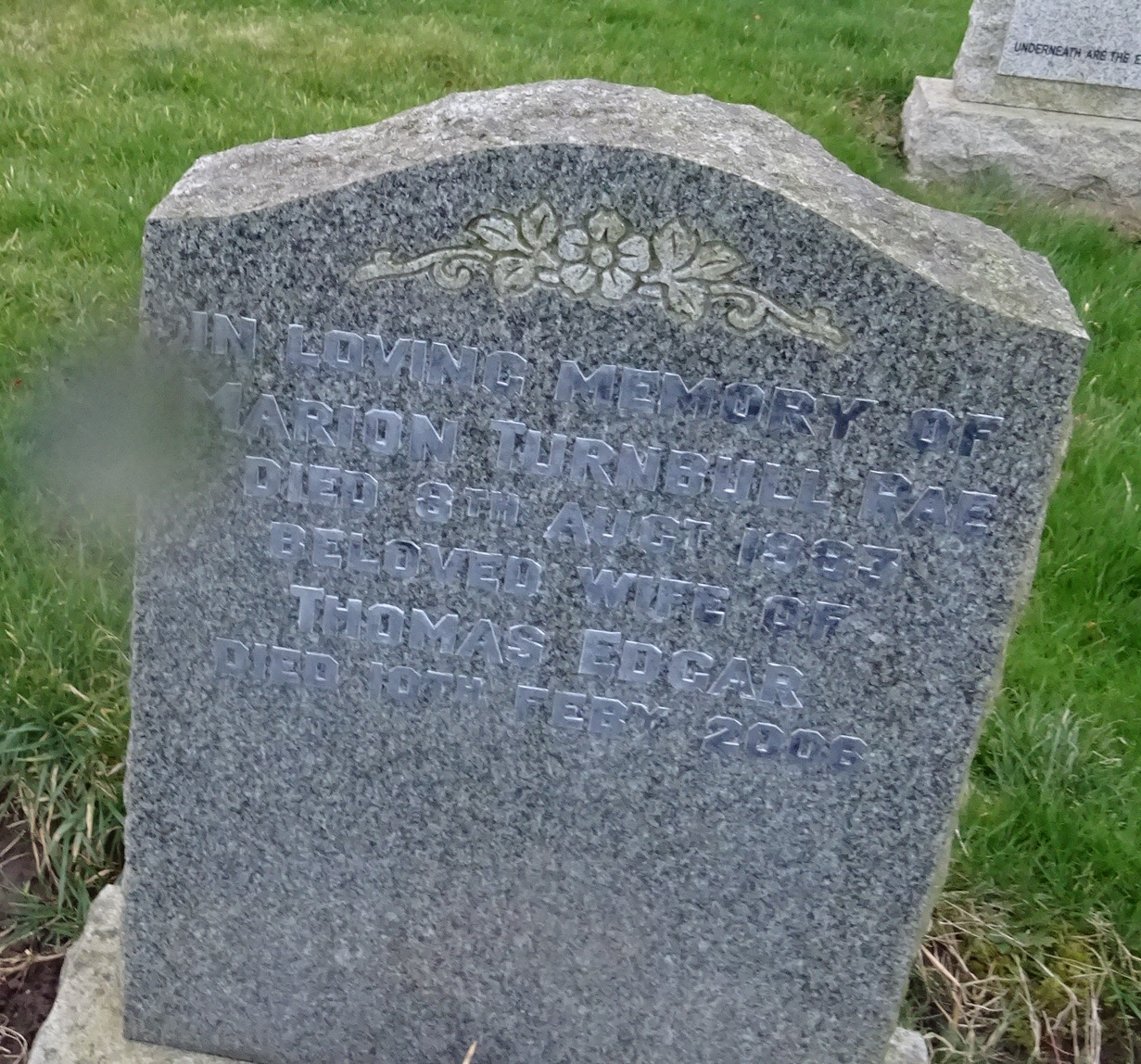 In loving memory of MARION TURNBULL RAE died 8th August 1983 beloved wife of THOMAS EDGAR died 10th Feb 2006
