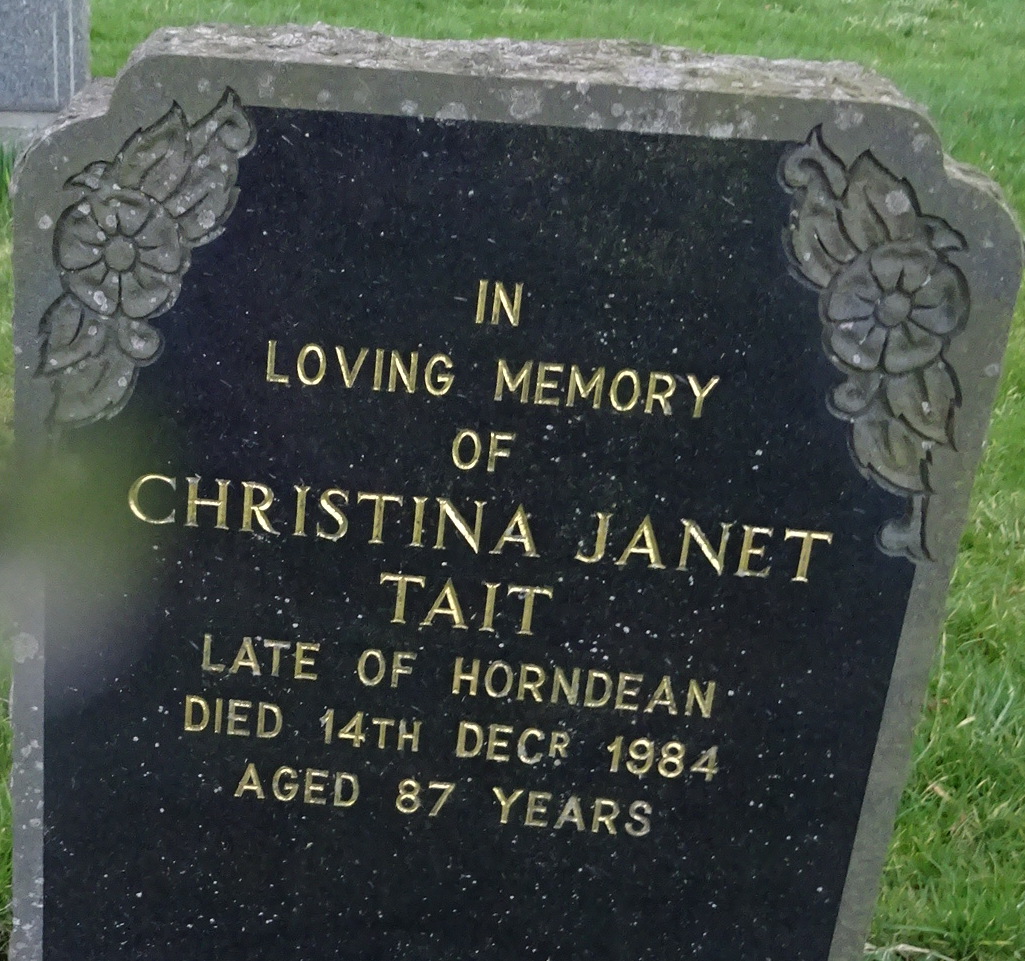 In loving memory of CHRISTINA JANET TAIT late of Horndean died 14th Dec 1984 aged 87 years