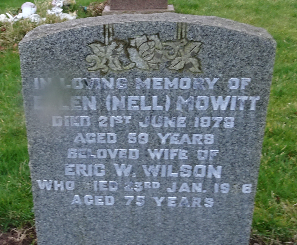 In loving memory of ELLEN (NEL) MOWITT died 21st June 1978 aged 58 years.