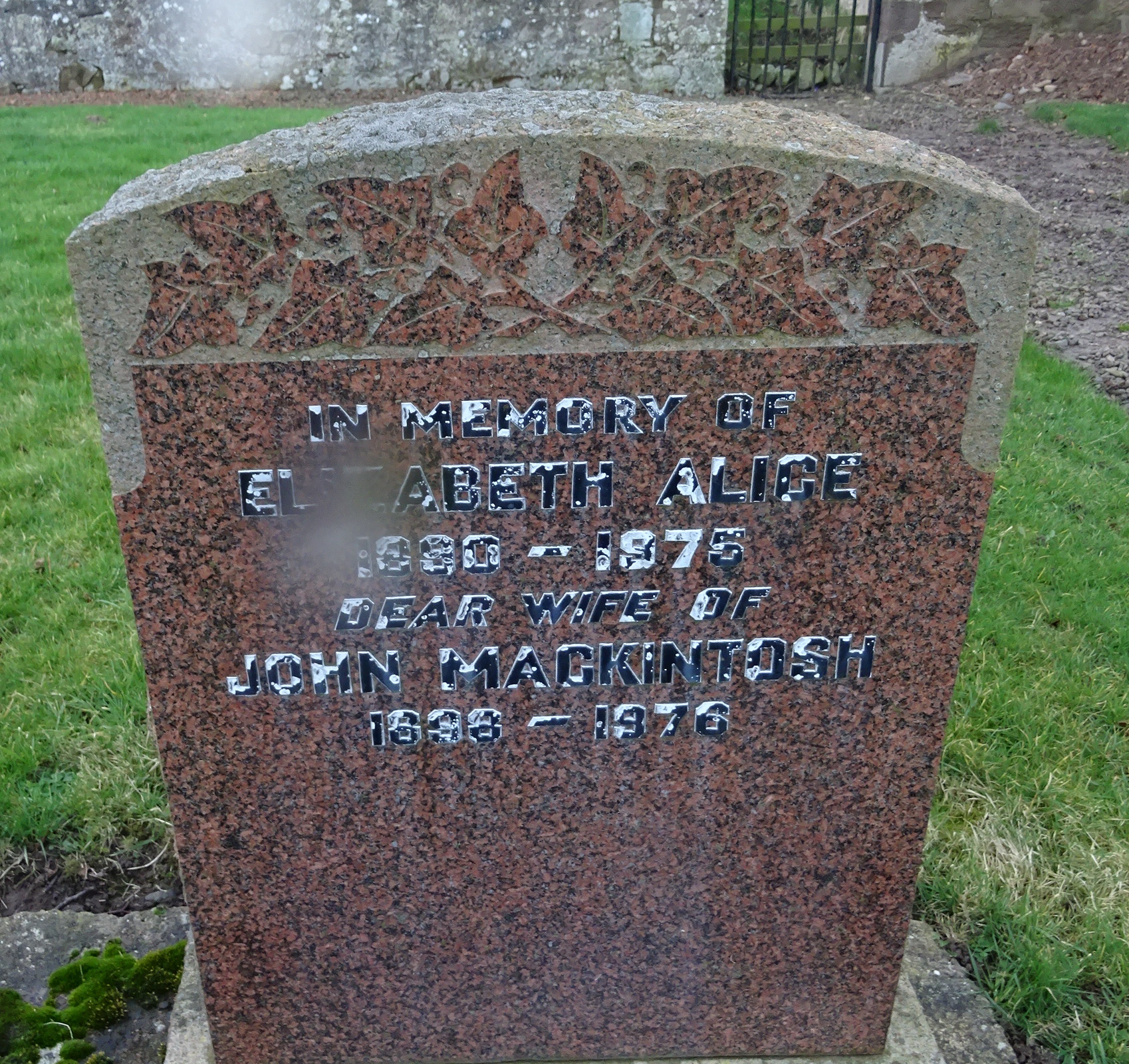 In memory of ELIZABETH ALICE 189 – 1975 dear wife of JOHN MACKINTOSH 1896 – 1976
