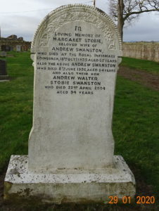 In loving memory of MARGARET STOBIE beloved wife of ANDREW SWANSTON who died at the royal infirmary Edinburgh 18th Oct 1935 aged 62 years.