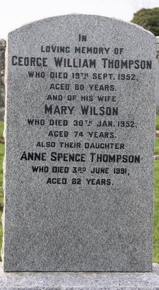 In loving memory of GEORGE WILLIAM THOMPSON who died 19th September 1952 aged 80 years. And of his wife MARY WILSON who died 30th January 1952 aged 74 years. Also daughter ANNE SPENCE THOMPSON who died 3rd June 1991 aged 82 years.