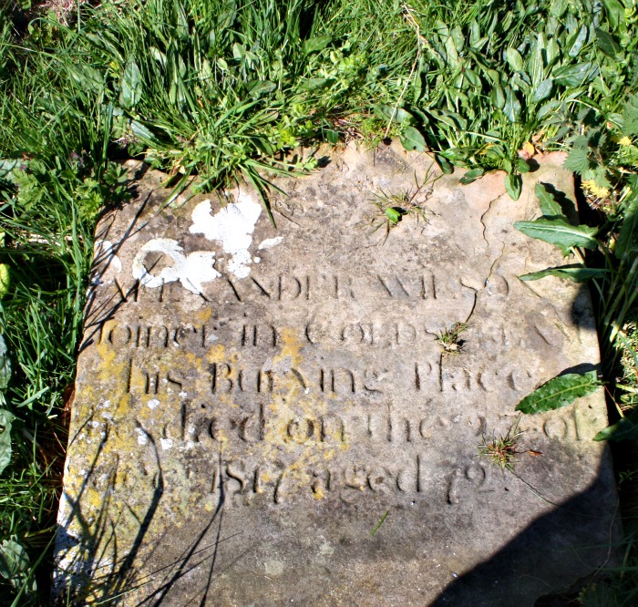 (Fallen headstone) ALEXANDER WILSON joiner in Coldstream his burying place died 23 December 1817 aged 72 years.