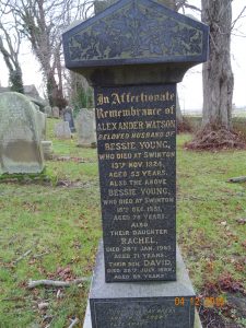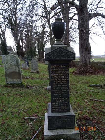 In affectionate remembrance of ALEXANDER WATSON beolved husband of BESSIE YOUNG who died at Swinton 13th Nov 1924 aged 55 years.